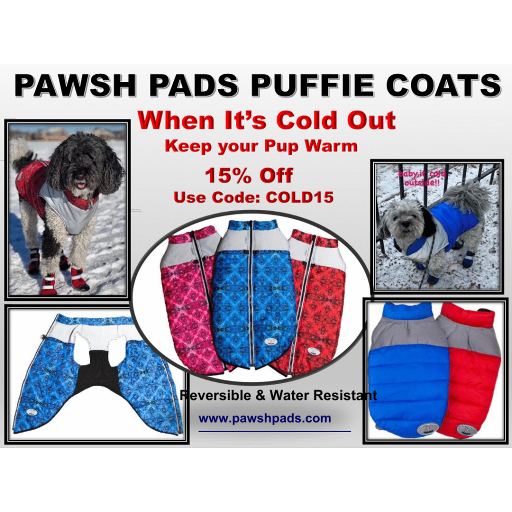 Pawsh Pads Puffie Coats are warm, lightweight, water-resistant, and reversible. Each style includes reflective shoulder panels that enhance visibility during nighttime walks. The Velcro Puffie style is best for slender dogs, while the Zipper Puffie features a large, user-friendly top zipper and stretchy tummy fabric, making it an excellent fit for chesty dogs. Use code COLD15 for 15% off your order. www.pawshpads.com