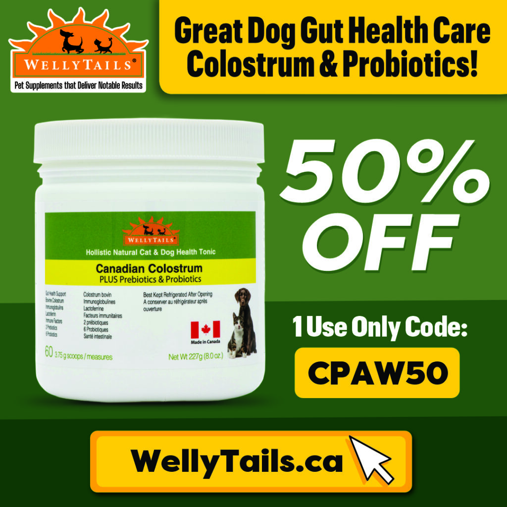 WellyTails Canadian Bovine Colostrum + Probiotics & Prebiotics supports cat and dog health by boosting the immune system. Bovine colostrum is rich in immunoglobulins, lactoferrin, and growth factors that help protect against itchy skin allergies, infections, and gut issues like leaky gut. Colostrum also promotes tissue repair, joint comfort, and vibrant skin, enhancing overall health and vitality – especially for kittens, puppies and senior cats and dogs. Use code CPAW50 to save 50% off your first order (one-time use only). https://wellytails.ca/